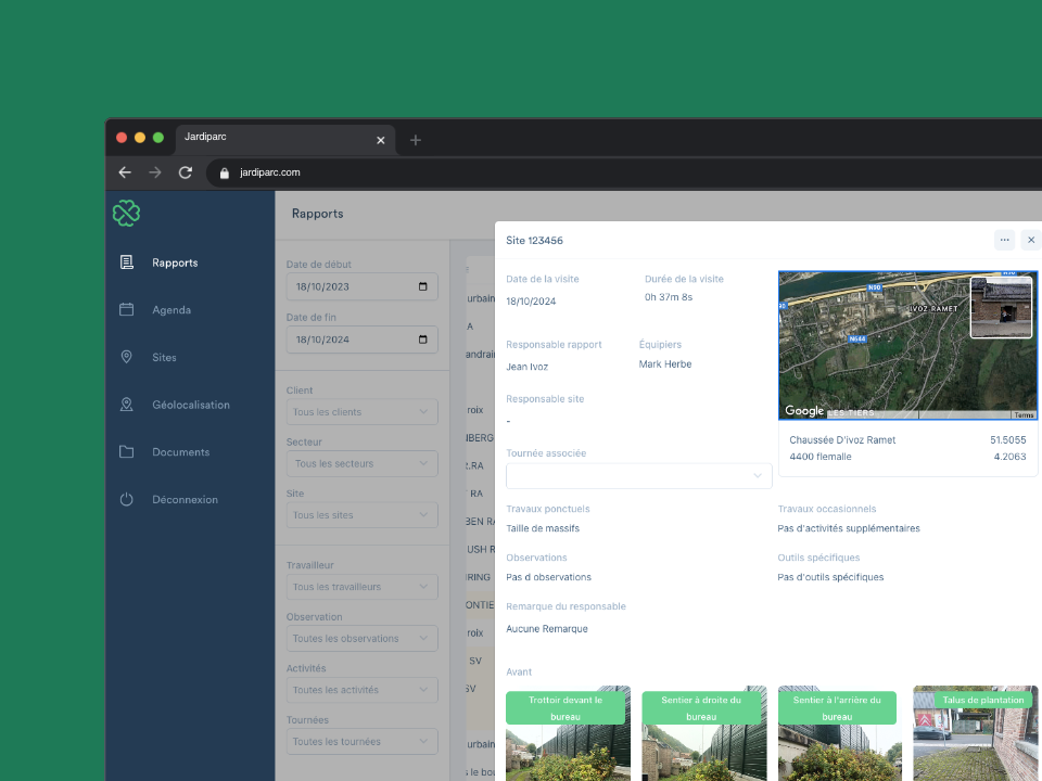 Access detailed reports for each site. You will find before-after photos, providing a clear view of the work performed. Our teams also add relevant observations on interventions. Each report is timestamped, ensuring complete traceability of operations performed.